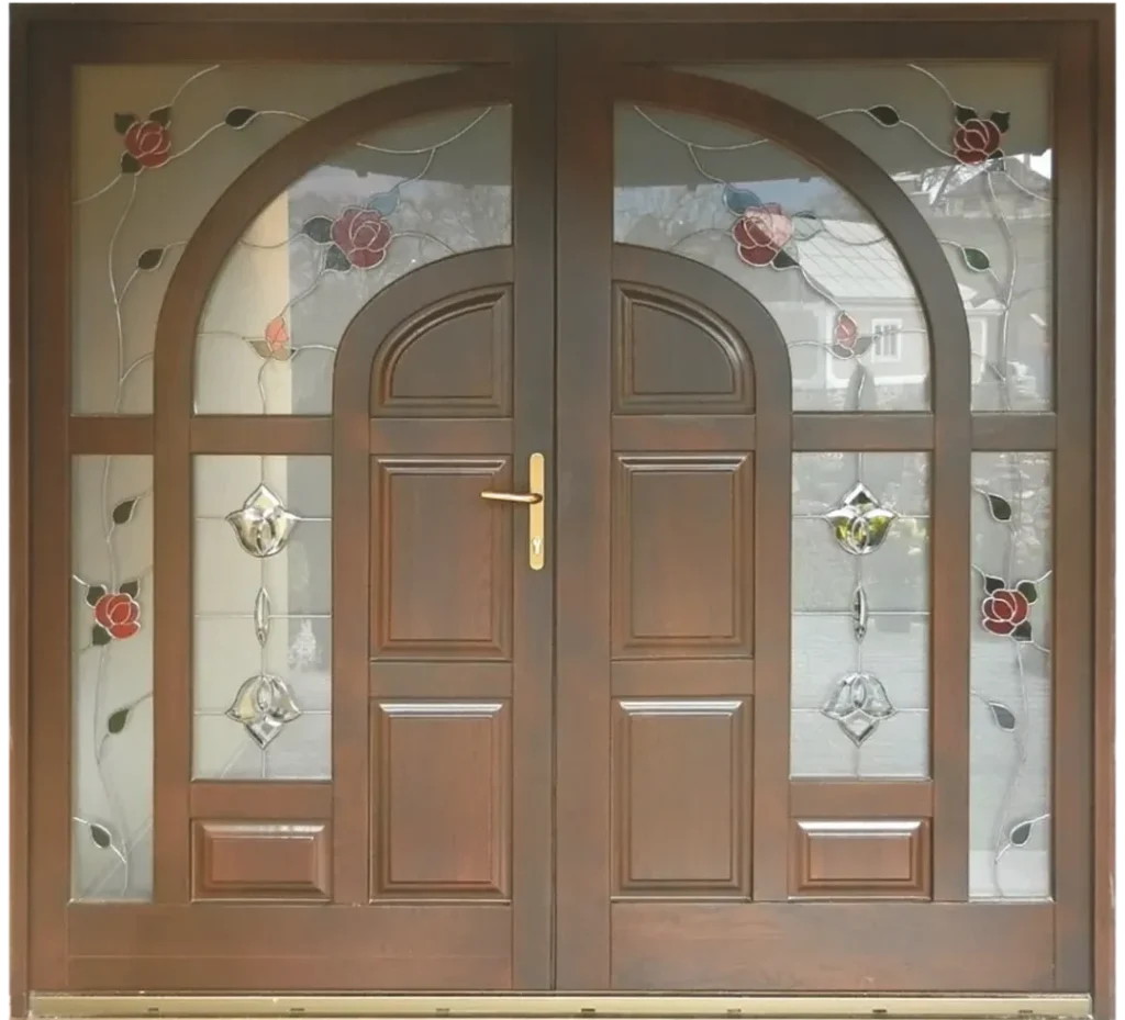 - Ușă din lemn triplu stratificat de esență de paltin, molid și frasin, cu inserție de sticlă decorată