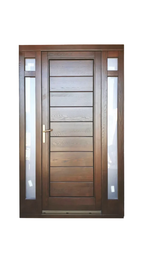 Rama de ușă, tocul și panoul central sunt realizate din lemn de molid/ paltin/ frasin dublu, triplu stratificat pentru rezistență maximă în timp.